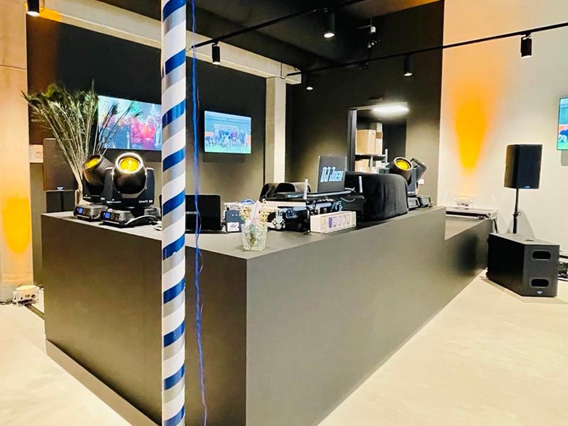 Hieronder krijg je een voorbeeld van onze 2 type installaties. We nemen voor sweets, verjaardagsfeesten en voorstellingen meestal de basis installatie (zonder truss constructie boven de DJ). En voor personeelsfeesten, trouwfeesten, jubilee’s… nemen we meestal onze luxueuze versie.